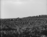 1542 Avant and Crawford. 20 acres of potatoes. Average 446 bushels per acre. W.E. Stiner, Contract Digger.; Men and teams of horses in field with bagged potatoes; barn is visible in background.