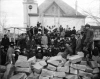 1540 Crowd of people gathered to celebrate laying the cornerstone of the addition to the Methodist-Episcopalian Church (original church building in background).