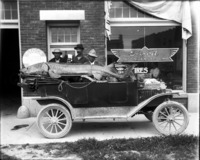1532 Sturgeon fished out of the Snake River; weight 330 Pounds, length 9 Feet 9 Inches. Caught by D.K. Frost, J.N. Jensen, F.C. Boone and Gus Williams; three men stand behind an automobile with a sturgeon covering the seats; in front of the Ford Motor Company located in the 100 block of Second Ave E.
