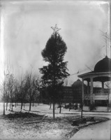 1533 Tree in City Park decorated for Christmas, with a star at the top. The wooden gazebo (band stand) and Twin Falls High School are also visible.