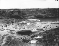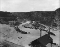 1520 Automobiles line the edge of the canyon at Twin Falls (waterfall) for the exhibition of Idaho Power's House of Today, a model home featuring new technologies that will become the home of the power plant's superintendent. Also visible are other buildings, and power plant structures.