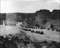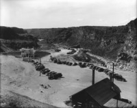 1519 Automobiles line the edge of the canyon at Twin Falls (waterfall) for the exhibition of Idaho Power's House of Today, a model home featuring new technologies that will become the home of the power plant's superintendent.