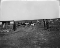 1513 Six men herding dairy stock along a lane; a shed and other outbuildings are visible.