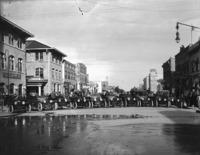 1515 Ten Buick automobiles with riders and drivers park across Main Street in front of the Perrine Hotel. Businesses seen: Rexall Drug Store, Hatter, Ladies and Gents Shine, Alco Clothes Shop, The Jewel, Grocery, Hickler's Cash Store, Varney Candy, Cafe, Independent Meat Market, The 5 and 10 Cent Variety Store, Light and Power, Roberts-Daly Company Bowling, Cotillion Hall, Drugs, Kingsbury Printing Company
