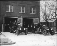 1517 Twin Falls Fire Department; seven men and two engines in front of the station. From left to right are Zeke Bartlett, Walter Frazelle, Ray King, Ralph Foster, Roy Mingo, Parley Smith, Jack Bell, and Sam Gibbs (names from G 3389).