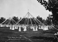 PC-2331 "The May Poles;" two groups of young women dressed in white at maypoles, with a crowd of people watching in City Park on May Day.