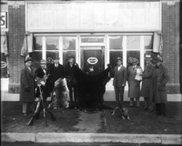 1474 Eight men with hunting trophies, standing before the Oakland Motors storefront. Pontiac emblem also visible.