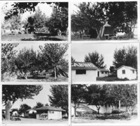 1476 A collage of six photos of a tourist camp, with tents, cabins, automobiles set among trees.