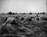 1334 "4 acres of oats - 500 bushels. Grown by David Jinks on M.E. Finch Ranch;" man, a young girl, and a dog in a field.