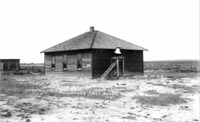 GB 058 "Hollister's First School House and Church;" a one-story wooden frame building. A bell on a platform is at the rear, with a ladder leading to the top. A smaller outbuilding is on left.