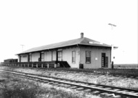 GB 061 Railroad station (depot) at Buhl. A water tower and a smaller outbuilding at left; several rail cars on tracks behind station.