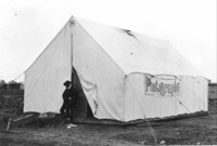 GB 055 Clarence E. Bisbee posing in front of his photography tent studio.