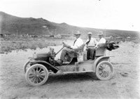 GB 065 Three men in an automobile (car) at the Salmon Dam construction site. Center man is Clarence Bisbee; his photographic equipment is in the case at his feet.