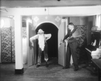 1256 Six cast members of an amateur theatrical, standing on a stage set.