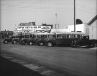1253 Seven Warberg Transfer Company trucks parked below a large sign for Covey Gas and Oil Company.