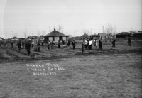 PC-2303 "Garden Time. Lincoln School;" children and adults, with hoes and shovels, work in a field at the school; houses and other buildings in background.