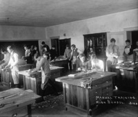 PC-2309 "Manual Training. High School;" students working with saws, other carpentry tools in Twin Falls High School classroom.
