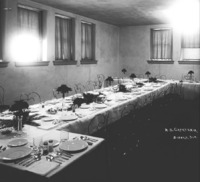 PC-2308 "H. S. Cafeteria;" tables set with full place settings, linens, and flowers at Twin Falls High School.