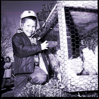 KEL 553 Four-year-old Dennis Johnson, looks at a cage of white hens at the auction at the farm estate of the late Howard Lapray. He is wearing a coat and a hat with ear flaps. A standing woman, some trees, and a stack of hay bales are in the background.