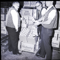 KEL 559 Sacking oranges for a sale being sponsored by the Magic Valley Jaycees to raise funds for needy children are, from left to right, Steven Porch, Darrell Sweet, and Alvin Wonenberg, members of the Twin Falls Jaycees. The three men are dressed in slacks, ties, and striped vests. Boxes of oranges are stacked up behind them.