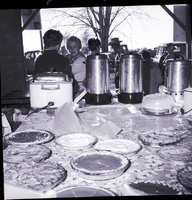 KEL 555 Warm pies, coffee pots, and a crock pot crowd a table in a makeshift cafeteria inside a shed on the Howard Lapray farm north of Filer. The Cedar Draw Community Club provided pie, hot coffee, and hamburgers to more than four-hundred people who attended the farm sale. A group of men and women, parked cars, and trees are in the background.