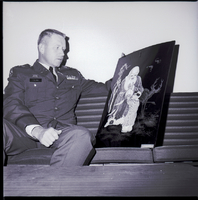 KEL 562 Captain Ray Young sits on a couch in his military uniform after returning to Twin Falls from the war in Vietnam after serving there for eleven months. On the couch beside him is a Vietnamese painting depicting an old man with a long beard holding a staff, a young boy holding a peach, and a deer. The painting was a gift from Captain Dinh, a Vietnamese air force pilot, whose father was one of three engineers aboard a train which was blown up by Viet Cong and taken by the enemy to the town of Muong Maun. Capt. Young, Capt. Dinh, and a helicopter crew flew into the area and brought the three engineers to safety. He received the painting as a reward during a party given by a Vietnamese fighter squadron.