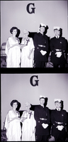 KEL 561 New officers of the Masonic Commandary and Social Order of the Beauceant from left to right, are Mrs. Rex Reed, oracle; Mrs. Fay Hann, worthy president; Rex Reed, eminent commander; and Richard Wheeler, outgoing eminent commander. The women are wearing white robes with a cross on the shoulder, and are holding a gavel. The men are wearing their uniforms. A large "G" is on the wall above them, and a folding chair sits in the corner.