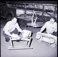 KEL 546 Repairing broken toys to be given for Christmas to underprivileged children are TFFD firemen James Miller, left, and Herman Carlton. Mr. Miller works on repairing a baby carriage, while Mr. Carlton works on repairing a toy car. A rocking horse is in front of them. A fire engine is in seen in the background.