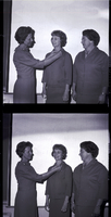 KEL 509 Mrs. D. A. Jackson, president of the Magic Valley Memorial Hospital Guild, pins the past president pin onto former Guild president Mrs. LeGrande Nelson, while president-elect Mrs. Frank Flint watches. Mrs. D. A. Jackson is wearing a dress, while the other two women are wearing jackets and skirts.