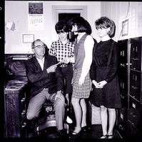 KEL 510 Twin Falls City Commission Chairman Egon Kroll buys a ticket to the March of Dimes Benefit Dance from TFHS Pep Club members Chris Emerick, Jerri Quigley, and another club member. Egon Kroll is wearing a suit and tie and the girls are wearing blouses and skirts. Egon Kroll is seated in an office chair behind a desk. On the wall behind him is a coat hanger, calendar, and certificate. Some file cabinets are along the side wall.