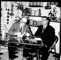 KEL 504 Vardis Fisher signs copies of his book "Mountain Man" at Sallie's Gifts & Books in Twin Falls. He is seated at a table and Twin Falls City Manager H. L. Derrick sits beside him, getting his book signed. On the shelves behind him are copies of the book and various antiques and gift items.