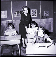 KEL 511 Ida Allen, Idaho's Teacher of the Year, helps a student read in her first grade classroom at Harrison Elementary School in Twin Falls, Idaho. From left to right, students David McMullin, Rusty Smith, and Carrie Kiely, sit at their desks reading textbooks. Several posters are on the wall behind them.