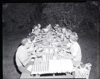 KEL 112 Supper Club members sit at a picnic table at Dierkes Lake and eat a meal of steaks and salad. Seated on the left side of the table, from front to back, are Max Brown, Mrs. Brown, Mr. C. P. Parrish, Mrs. Parrish, and Dr. George Rush. Seated on the right side of the table, from front to back, are Mrs. Thompson, Mr. Lloyd Thompson, Mrs. Beck, Mr. Paul Beck, and Mrs. Rush. The table is covered in a table cloth, and on the table are plates of food, cups, silverware, condiments, a bowl of salad, a cooler, and a paper bag. On the ground beside Mrs. Thompson is a large purse. Several trees and bushes surround the area.