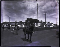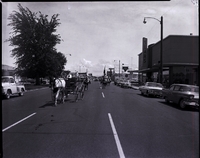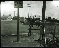KEL 102 Two children stand on the corner of 2nd Ave. S. to watch the procession of queen candidates and riding club members in the Magic Valley Western Horse Show Parade. A little girl leans against a wire fence. Two horses trot down the street, the women riders dressed in cowboy hats and boots. A one-way sign, stop sign, and 25 MPH sign are visible. A Wonder Bread truck is on the street, and painted on the back are the words "Helps build strong bodies 12 ways!" Several buildings including a cafe and auto shop are in the background.