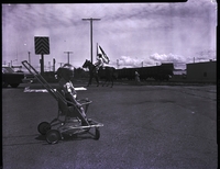 KEL 101 Jeffrey Leazer, two-year-old son of Mr. and Mrs. Richard Leazer, sits in a stroller at the Magic Valley Western Horse Show Parade. Two horses trot side by side in the background. The rider in front, a woman wearing a cowboy hat and boots, holds a white flag. The rider behind her holds an American flag. Some railroad tracks, a train, a car, some street signs, and a woman walking are visible in the background.