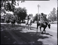 KEL 103 A procession of women on horses, dressed in cowboy hats and boots, ride down a street in the Magic Valley Western Horse Show Parade. Another group of women ride down 5th St. W. Some houses, automobiles (cars), and a truck carrying a car are in the background. Several trees line the street.