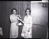 KEL 099 From left to right, Mrs. Robert Long, Mrs. S. Merrill, Mrs. Victor Fletcher, and Mrs. Rex Harris receive an education award from the Shell Oil Company at a state meeting of the Idaho Federation of Women's Clubs convention held in Twin Falls. The four women hold a framed certificate reading "General Federation of Women's Clubs Shell Oil Company Education Program 1964 Award of Achievement, Idaho Falls Women's Club, Idaho Falls, Idaho, For its outstanding program of helping young people in its community to further their education." Mrs. Fletcher holds a $500 check.