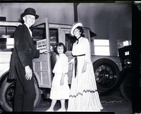 KEL 081 Robin Spofford opens the door to a 1929 Ford Station Wagon for Pamela Klimes, center, and Mary Trounson, right, at a Horseless Carriage Club tour and old-time fashion show. Mr. Spofford is dressed in a suit, bow tie, and bowler hat. The girls are wearing dresses, and Ms. Trounson has a wide-brim bonnet. The sign in the window of the car reads "1929 Ford Station Wagon."
