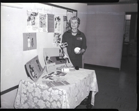 KEL 068 Mrs. A. S. Hanson stands in front of a display in the Church of the Brethren at the United Church Women's May Fellowship luncheon. She holds several spools of thread and some cloth. On the wall behind her, posters read "Migrant Ministry," "Will you volunteer? Ladies are urgently needed to cut patterns, distribute material, etc. in the Twin Falls Labor Camp Sewing Room. If you can assist please register your name. Thank you," "Enough if something from our hands have power to live, and act, and serve the future hour," "Pride and humiliation hand in hand walked with them through the world," "For you are all one in Jesus Christ," and "Whatever makes men good Christians, makes them good citizens." The display shows illustrations of women cutting cloth and sewing, and a placard reads "You can help! You can donate material, needles, thread, yarns, pins, patterns, etc. Please register your name. Thank you." Several books are on the display table.
