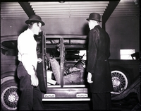 KEL 078 Mr. and Mrs. Ben H. Minger polish a 1931 DeVaux car at a Horseless Carriage Club tour and old time fashion show. Mr. Minger is dressed in a plaid shirt, slacks, and a boater hat. Mrs. Minger is dressed in a wide-brim bonnet, dress, and long gloves. Some folding chairs line the wall, and people are walking in the background.