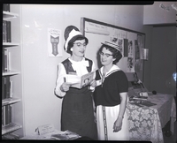 KEL 069 Speakers at the United Church Women's May Fellowship luncheon include, from left to right, Mrs. W. R. Hatcher, state president of the Christian Women's Fellowship and local magazine chairman for United Church Women, and Mrs. Richard Barton, local president of the United Church Women. They are wearing dresses and hats look at "The Church Woman" magazine in a hallway at the Church of the Brethren. A sign on the wall behind them reads "The Church Woman Subscribe Here." The table beside them have several copies of the pamphlet and a placard reading "Race - The New Challenge. 21st Annual Institute of Race Relations June 29 - July 11, 1964. Fisk University." A bookcase filled with books and a display table are in the background.