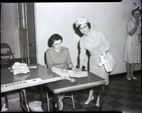 KEL 073 Registering at the South Central Home Demonstration Council meeting held at the Methodist church is Mrs. Roy Hondo, Cassia county council president, right. She is dressed in a dress, hat, and white gloves. Mrs. Harvey Maxon, Twin Falls county treasurer, is directing the registration. She sits behind a table, holding a pen and looking at some forms. A table to the side reads "Registration." Syringa Club members were in charge of the registration. Another woman stands in the background.