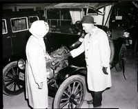 KEL 077 Looking under the hood of a 1915 Model T Ford car at a Horseless Carriage Club tour and old-time fashion show are Mr. and Mrs. Roy C. Bishop. Mr. Bishop is dressed in a long coat, bowler hat, and leather gloves, and Mrs. Bishop is dressed in a long coat, dress, and bonnet. A sign in the window of the car reads "1915 Model T Ford, Roy C. Bishop."