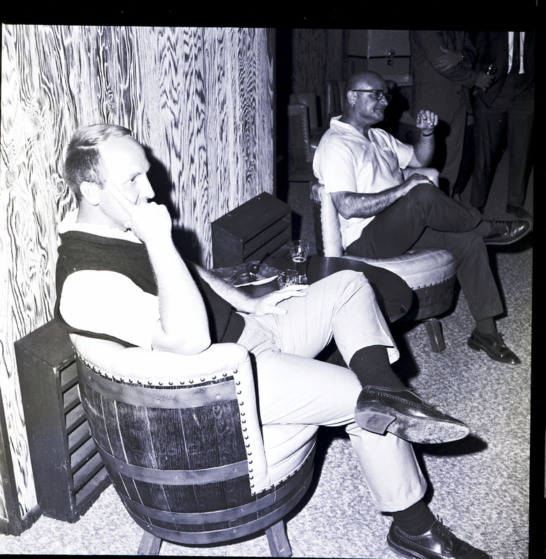 From left to right, Ron Watson and John Campbell sit in chairs at a Farewell Party for Merl Eden held at the home of Tommy Walker. A round table is between them, and on the table are two glasses and an ash tray. Some other men are seen visiting at the back of the room.