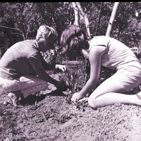 - A woman and a girl gather dandelions from a weed patch to use in salads. The woman is dressed in a blouse, floral-print pants, and low heels. The girl is dressed in a matching sleeveless shirt and shorts. Behind them are several trees.