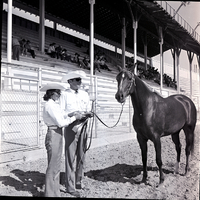 The top Arabian mare, Carinosa, owned by Dr. and Mrs. B. P. Husband, stands in a corral at the Idaho All-Arabian Horse Show. From left to right, Gerrie Paladini presents a dish trophy and award ribbon to Jeff Wonnell, the mare's trainer. They are dressed in cowboy hats and boots. To the side of the corral, several people sit on bleachers watching the horse show.