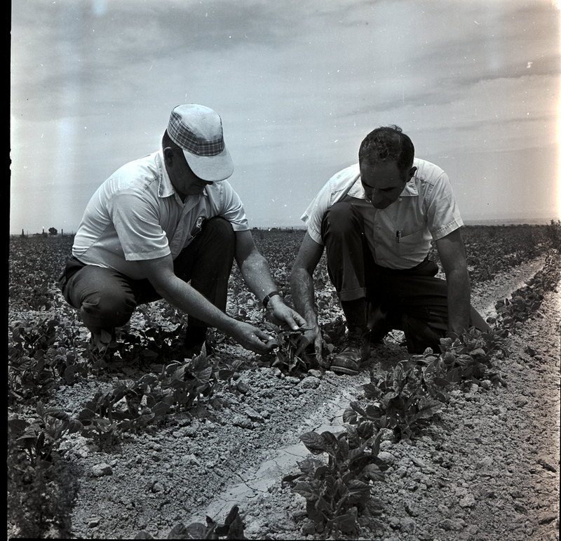 Donald Youtz, Twin Falls County agent, left, and Marshal LeBaron, superintendent of the Twin Falls branch of the University of Idaho Experiment Station, right, check wind damage to beans in a field. The leafy tops of the bean plants in the field stretch into the background.