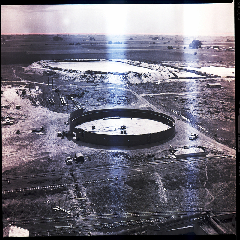 Construction work by Pittsburgh-Des Moines Steel Co. on a new six-million-gallon steel tank at the Twin Falls Amalgamated Sugar Co. factory is well under way. When the tank is completed sugar will be stored in raw juice form in the tank. The tank will hold an equivalent of 360,000 bags of refined product. Several construction supplies and trucks are seen around the site. Railroad tracks run to the south of the new storage tank site.