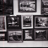 - A wall is covered in oil paintings of landscapes at the Gooding County Fair.