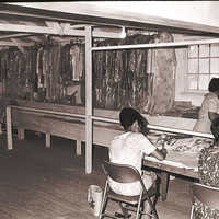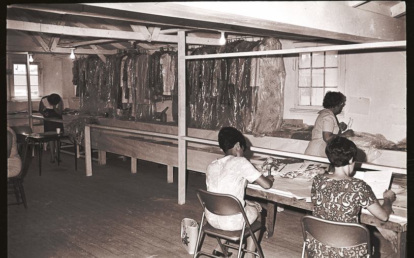 - Women inspect some clothing in a building at the Gooding County Fair. Several articles of clothing hang covered in plastic on hangers from a rafter.